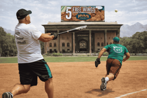 Purple trailed by nine entering the buffet. Jeff Stone got two quick outs, retiring Patrick Schmidt and Rick Jensen on grounders to second baseman Scott Wright. Larry Shupe came up and smoked a triple over the head of Ken Brown in right-center – I don’t think I was alone in rooting for Larry to Go for the Pluckers, but he elected to not risk making the final out in search of personal glory. The game ended with Jeff Stone getting Daniel Baladez to pop out to first baseman Dale Fugate.