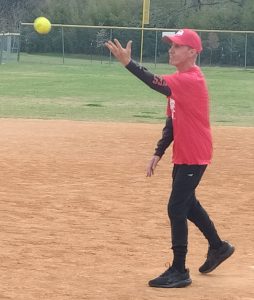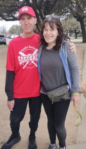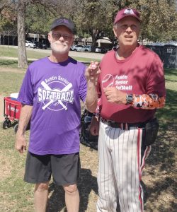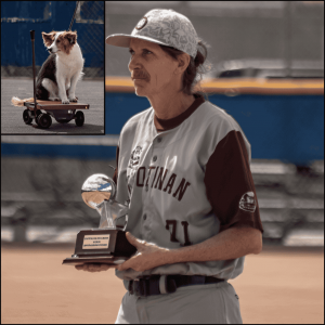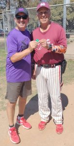 Jeff Stone, kind of seen here, received the season’s first Ohtani Award from Decoy the dog – he (Jeff, not Decoy) was the winning pitcher for Maroon and went 2 for 2 with a walk at the plate.
