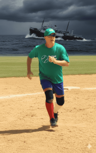 Purple trailed 16-11 entering the buffet, and proceeded to grab the lead, its 1-7 hitters all hitting safely to start the inning, five singles to start, then Chris Waddell’s bases-loaded, game-tying triple, and then Peter Sundquist’s double to drive in Chris with the go-ahead run. David Pittard retired the next two batters, catching Jim McAnelly looking at a called strike three and getting Tommy Gillis to ground out to second baseman George Brindley, who made an excellent play to his left of a hard-hit two-hopper. Anthony Galindo singled in Peter, joining Chris and Ray Pilgrim with 4-for-4 games. David got Matt Levitt to pop out to shortstop Jimmy Sneed, and Blue came up needing two to tie, three to win, its mercenaries due to lead off the bottom of the buffet.