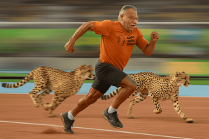 Ray Pilgrim shut out Gray again in the top of the fourth, working around David Pittard’s two-out single, and Orange effectively put the game out of reach with five runs in the bottom half, on seven singles and David Brown’s sacrifice fly to Tommy Gillis in left field. I want to mention that as part of that rally, Ray Pilgrim went first to third on Terry O’Brien’s single to right. Ray was a running maniac all day, legging out a double and scoring from second on a single in the middle game, and generally outpacing the cheetahs that view him as a role model: