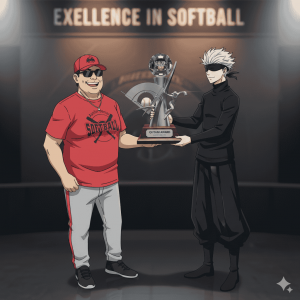 Joe Bernal is remarkably animated as he receives his seventh Ohtani Award of the season from Satoru Gojo.