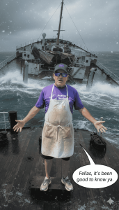 Purple was chasing eight runs entering the buffet. When the first two batters went out – Richard Battle flied out to Tom Bellavia in left-center field, and Raul Deleon grounded out to second baseman Tom Brownfield, who had a good game in the field – old salt/team cook Rick Jensen stood on the deck of the Edmund FitzPurple, saw a main hatchway caved in, and declared…