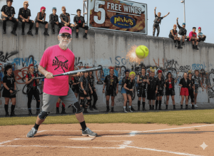 Green held a 13-10 lead entering the buffet. Clint Fletcher walked and Terry O’Brien singled to start the inning, but Chunky Wright got Peter Atkins to fly out to Mike Garrison in left for the first out, so hope wasn’t yet lost. But David Brown doubled, Clint scoring, and then Ray Pilgrim singled in Terry and David to tie the score. Daniel Carvajal singled, completing a 4-for-4 game at the plate. Terry Thompson singled, Ray’s pinch-runner scoring the go-ahead run. Marvin Krabbenhoft walked, loading the bases. Boo Resnick also walked, forcing in Daniel, making it 15-13 Orange. Larry Shupe’s sacrifice fly to Steve Browne in left-center brought in Terry Thompson’s runner, Clint Fletcher, who then stepped up and singled in Marvin’s runner. That made it 17-13. Terry O’Brien doubled, his second hit of the inning, driving in Boo – 18-13. Peter Atkins hit his second double of the game, Clint and Terry scoring – 20-13. And David Brown knocked his second single of the inning, his fourth hit of the game, driving in Peter – 21-13, and the teams flip-flopped.