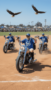 In fact, Blue’s 1-3 hitters, Steve SandallJimmy Sneed, and George Brindley, proved unstoppable in this game, each going a perfect 3 for 3 at the plate, combining to score eight runs and drive in six. Basically they continually circled the bases like a jolly troop of motorcycle riders smilingly terrorizing the populace, as seen here: