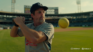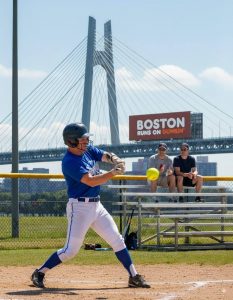 Green led 10-8 entering the final five-run inning. Blue scored three times in the top half to go ahead by a run, David Pittard’s triple to right field the key hit: it drove in Tom Bellavia and George Brindley, who’d singled, with the first two runs, and David scored the third on Daniel Baladez’s base hit. Here’s David putting a hurt on Chunky Wright’s pitch, as Matt Damon and Ben Affleck look on: