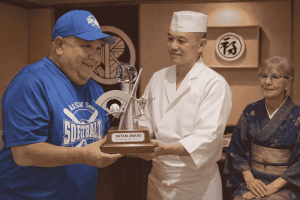 Joe Bernal earned his league-leading fourth Ohtani Award of the season, going 2 for 2 with a pair of walks while pitching Blue to victory. He received his award from the great sushi chef Yasumitsu Watanuki, with the equally great Diane Brown looking on.