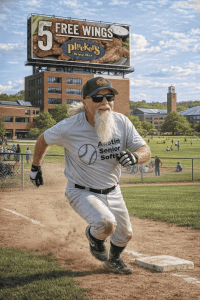 Trent got two quick outs to start the buffet, getting Jack Kelly to ground to second baseman Mark Dolan – Johnny Lee made a good play, a bit of a snow cone, on a throw that Mark had to hurry in order to beat runner-from-home Jim Foelker – and Peter Atkins on a fly to deep left-center, Tommy Gillis making a very good catch moving back and to his right. The top of Gray’s order then came through in a big way. Clint Fletcher legged out a pop-fly triple to right-center, completing a perfect day at the plate and three-quarters of a cycle. Paul Rubin drew a walk, his second of the game. Bobby Miller then came up and slashed a line drive to right field, to the fence, for a three-run inside-the-park home run, Bobby’s first of the season. Here he is rounding third base:
