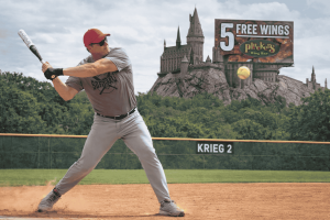 Purple wasn’t able to take advantage, however, as Joe Bernal retired the side in order in the bottom half. The second out of the inning was the fan-favorite defensive play of the day. Ray Pilgrim crossed up the scouting report by driving a pitch to right field, a ball that looked like extra bases off the bat. But right fielder Daniel Baladez got a good jump on the ball, raced back and to his right, and ran the ball down, to the delight of all looking on. This AI rendering does not do the play justice…