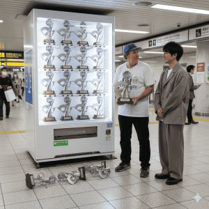 Jeff Stone receives his league-leading tenth Ohtani Award of the season – so many, he can’t hold them all at once – as pop star Fujii Kaze looks on.