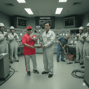 Joe Bernal receives his sixth Ohtani Award of the season from chief engineer Masao Yoshida.