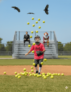 Unfortunately for Purple, Matt had stopped at first base, and he was deprived of a double. George Brindley was next up and flied out to right-center, Donnie Janac making a good running catch. Richard Battle hit a short pop in front of third base, and Jack Spellman continued his adventures in the field, coming in and attempting a basket catch, dropping the ball, but able to corral it and throw to second for the force, Matt out after he’d held up thinking I’d make the catch. That made me 0 for 3 on pops on the day, and it felt like this:
