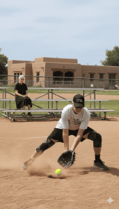 Maroon got off to a good start, holding Orange scoreless in the top of the first inning, stranding three runners. Clint Fletcher led off the game with a line single up the middle. Terry Thompson grounded to shortstop Ralph Villela, who threw to Tommy Langa for the force at second; Tommy’s throw to first then clipped Terry on the nose, bloodying it, as more or less seen here: