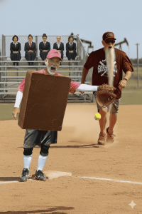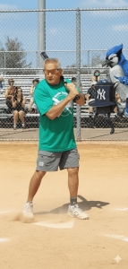 So Purple led 14-8 entering the buffet. Green had the top of its lineup due up, and proceeded to put on a hitting clinic. Ralph Villela and Phil Stanch led off with back-to-back doubles, cutting Purple’s lead to five runs. Larry Fiorentino made a good play to run down Mike Garrison’s drive to right-center for the first out. The next six batters – Chris Waddell, Donnie Janac, Greg Lloyd, Johnny Wimpy, Billy Hill, and Steve Browne – each singled, four more runs coming across. One of those singles, might have been Chris’s, was a sharp grounder to shortstop that took a bad final hop and hit me square in the cup, which, thank goodness for the cup.