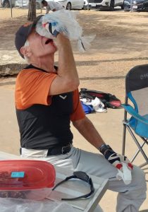 Orange then won both the third and fourth innings, scoring three times in each while Terry Thompson blanked Maroon in the home halves. Meat-and-potatoes rallies by Orange: three runs on Terry O’Brien’s walk and five singles in the top of the third; three more on three singles, a throwing error, and two walks in the top of the fourth, which saw a very scary moment. Orange loaded the bases on singles by Peter Atkins and Daniel Carvajal and a walk to Terry O’Brien, his third in as many trips to the plate. Ivan Budiselic caught Ray Pilgrim’s foul pop down the third-base side for the first out. David Brown lined out to second baseman Tommy Langa for the second out, excellent play by Tommy, but then he threw past first trying to double up Terry, and the runners all advanced, Peter scoring. Marvin Krabbenhoft lined a hit to right field, and the scary moment arrived: coming in to field the ball, Adam Reddell has his knee – left knee, I think, not 100% certain, though – buckle under him. You never want to see that. Adam was able to leave the field on his own power, but left the game, Jack McDermott setting down his Dos Equis and picking up his glove and going out to right field.