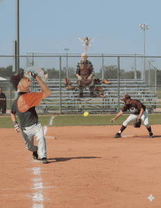Peter hit a grounder sharply up the middle, just beyond the reach of second baseman Scott Wright, and Clint easily scored from second – a good throw home was caught cleanly but too late by catcher Steve Hamlett as Orange walked off the win.