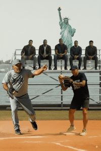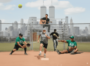 Blue trailed by six and had the top of its lineup up to start the buffet. Steve Sandall, Tom Bellavia, and George Brindley opened the inning with singles, loading the bases. Steve tagged and scored on Tom Brownfield’s sacrifice fly to Clint Fletcher in right field. Dave Pittard lined a ball to right-center but was robbed of a hit by Ken Brown, who I’m going to say got a terrific jump on a sinking line drive to his left, racing in to make the catch, the runner having to scramble back to third and first to avoid being doubled up. Daniel Baladez’s single completed a 3-for-3 day and drove in Tom, but the game ended with Tommy Deleon hitting into a 4-6 force, Scott Wright to David Brown. Final score: Maroon 12, Blue 8