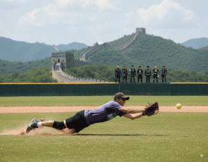 Gray hung tough, scoring four runs while producing eight hits in the bottom of the fourth. And really it was almost nine hits. How could this be? I will tell you. Jack Crosley and Mike Malay led off with singles. Dave Jaffe hit a pop to short left-center field. As Dave Berra described it, shortstop Ralph Villela went back on the pop, but dropped the ball while avoiding a collision with Steve Browne charging in from left-center. Ralph, on his butt, somehow retrieved the ball and, from his seated position, managed to throw to Chris Waddell at third to force out Jack, who’d had to hold up to see if the ball would be caught. Here is an incredibly accurate rendering of the play: