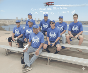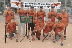 Terry O’Brien came up and delivered his fourth of the game, a line-drive single to right that scored both Daniel and David. Ken Mockler lined a single to left, putting the tying run on base. Peter Atkins ripped a double to center field, Terry scoring, Ken moving to third, Blue’s lead down to just one run. Terry Thompson stepped up and lined a single to right field: Ken trotted home with the tying run and Peter Atkins, ignoring his bruised hammy, raced home from second with the championship-winning run, Orange walking off a dramatic 19-18 victory to cap the 2025 season.
