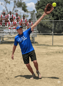 Orange then tied the game with three runs in the home half, all scored after two were out. Clint Fletcher singled to start the inning, then David Pittard got Daniel Carvajal to fly out to Steve Sandall in left field (again) and David Brown to pop out to the middle of the infield, just in front of second base – both Jimmy Sneed and Tom Brownfield converged on the ball and called for it, but Tom’s height and reach (see photo from the 10:00 game) determined who would actually make the catch. The third out proved tough to get. Ray Pilgrim walked. Terry O’Brien grounded a ball up the middle; Jimmy Sneed almost reached it, but it got through for a single, loading the bases. Ken Mockler popped a ball into short left-center field, just out of reach; Clint and David Brown, running for Ray, both were off on contact and scored, Terry racing to third. Peter Atkins singled off David Pittard glove, the ball caroming past second baseman Tom Brownfield, Terry scoring to tie the game at 4-4. Terry Thompson’s pop to Jimmy Sneed on the outfield grass behind shortstop ended the inning.